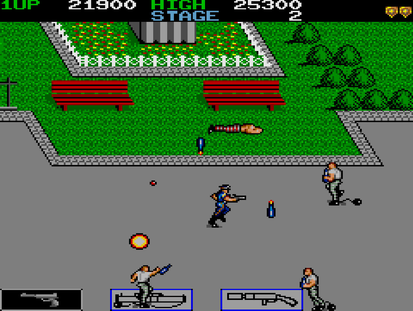 通常は銃でしか攻撃できないが、特定のキャラを救出するとバズーカなどのアイテムが手に入り、それを使った攻撃ができる。